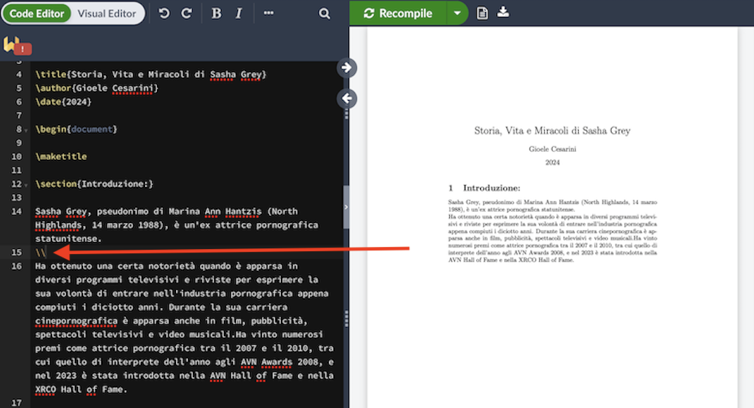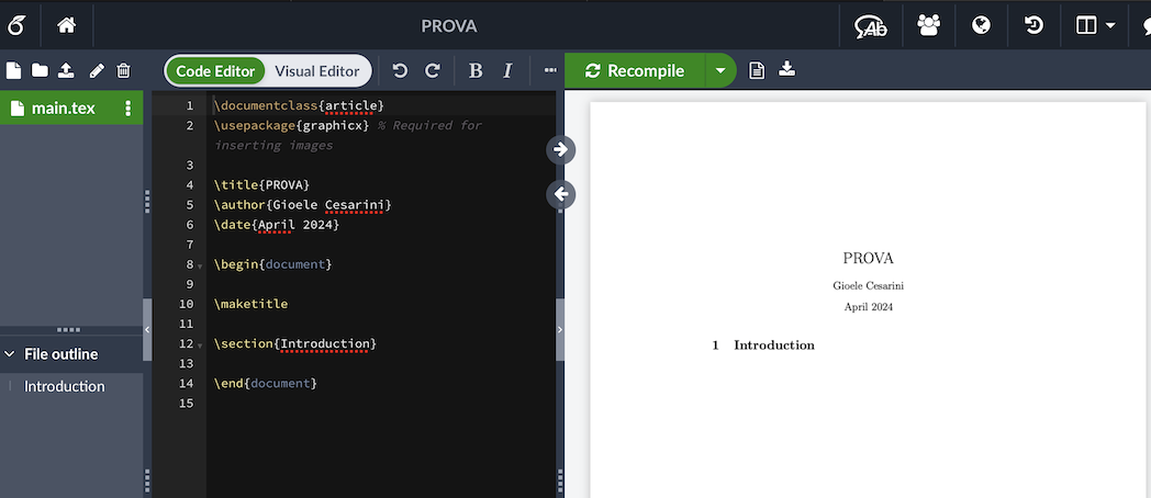 A sinistra hai lo spazio per scrivere il codice mentre sulla destra schiacciando il tasto "Recompile" hai il risultato del codice concretizzato nel tuo agognato file pdf.
